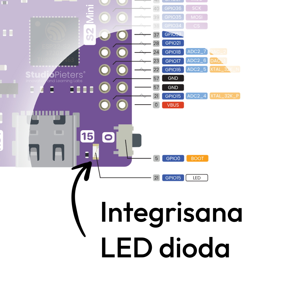 }Kako bi pojednostavili što je više moguće, za ovaj projekat nam neće trebati nikakva specijalna šema jer ESP32-S2 Mini ima integrisanu led diodu. Kao što možete vidjeti na slici ispod, sa desne strane USB priključka nalazi se led dioda koja je povezana sa Pin-om 15. Sve što trebate da uradite je da ubodete USB-C u ESP32-S2 mini, a drugi kraj u računar.