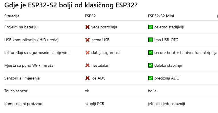 Sa tehničke strane, iako S2 ima samo jednu jezgru (što zvuči kao “manje”), u realnim IoT projektima to je često prednost: manje potrošnje, manje grijanja i predvidljiviji rad. Pored toga dobijaš touch ulaze, ADC sa boljom stabilnošću, velik broj GPIO pinova i mogućnost da mikrokontroler radi u ultra-low power režimima gdje troši samo nekoliko mikroampera.